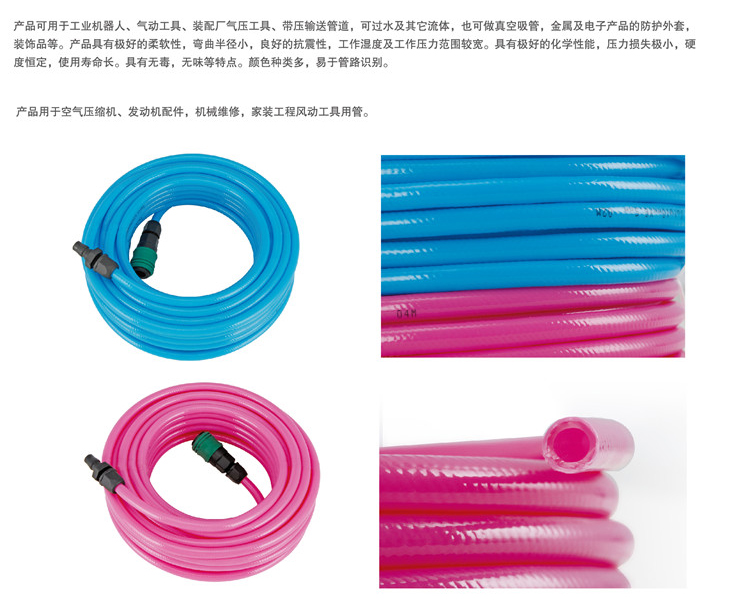 產(chǎn)品可用于工業(yè)機(jī)器人、氣動工具、裝配廠氣壓工具、帶壓輸送管道,可過水及其它流體,也可做真空吸管,金困及電子產(chǎn)品的防護(hù)外套,裝飾品等。產(chǎn)品具有極好的柔軟性,彎曲半徑小,良好的抗震性,工作濕度及工作壓力范圍較寬。具有極好的化學(xué)性能,壓力損失極小,硬度恒定,使用壽命長。具有無毒,無味等特點(diǎn)。顏色種類多,易于管路識別。